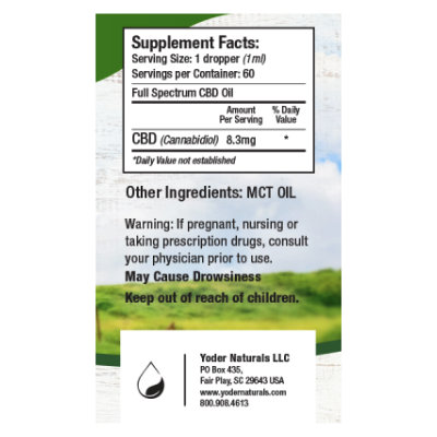 500 mg CBD per bottle; 8.3 mg CBD per 1 ml serving (one dropper full). 60 servings per bottle.